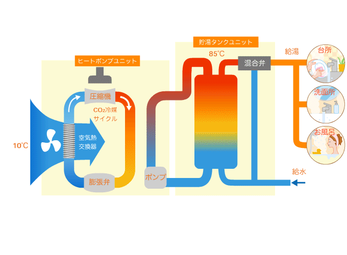 さらに、CO2冷媒は加熱能力にすぐれているため、ヒートポンプ方式(図)により、90℃のお湯を沸かす事が可能に。